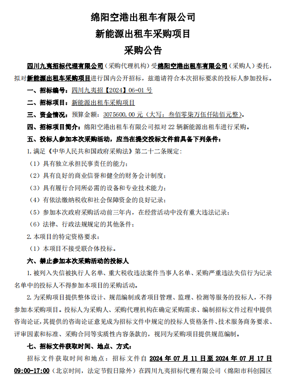 綿陽(yáng)空港出租車(chē)有限公司新能源出租車(chē)采購(gòu)項(xiàng)目采購(gòu)公告